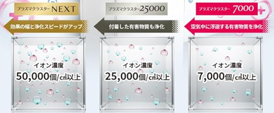 さらにプラズマクラスターNEXTの場合は、プラズマクラスター7000と比較して、静電気を抑える(除電スピード)は約9倍ですもちろん、消臭スピードなどもNEXTが一番高い能力を発揮します。ご予算の関係や設置スペースの問題もありますが、プラズマクラスターNEXTのより上位機種をご購入されることをおすすめします。